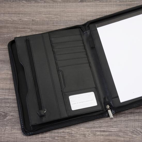 Descrição: Pasta convenção de couro sintético com zíper, possui 2 compartimentos grandes para arquivar documentos, compartimento interno com zíper, 7 divisórias pequenas para documentos, suporte com visor para cartão de identificação, suporte para caneta (não acompanha caneta) e bloco com 20 folhas pautadas.