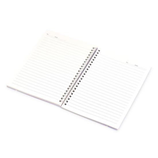Descrição: Caderno A5 com capa plástica e elástico para lacre, contém aproximadamente 80 folhas marfim com pauta.