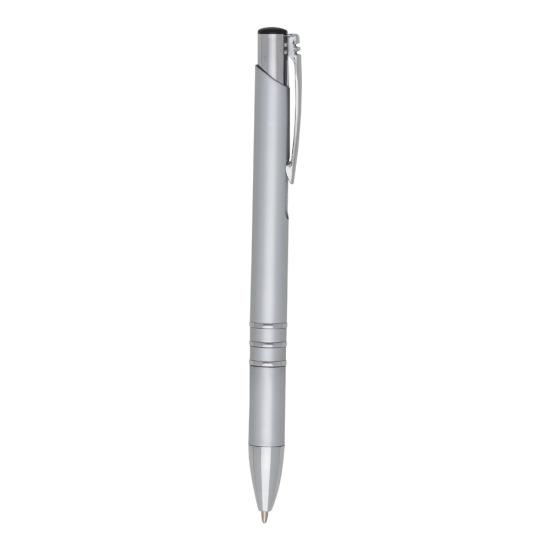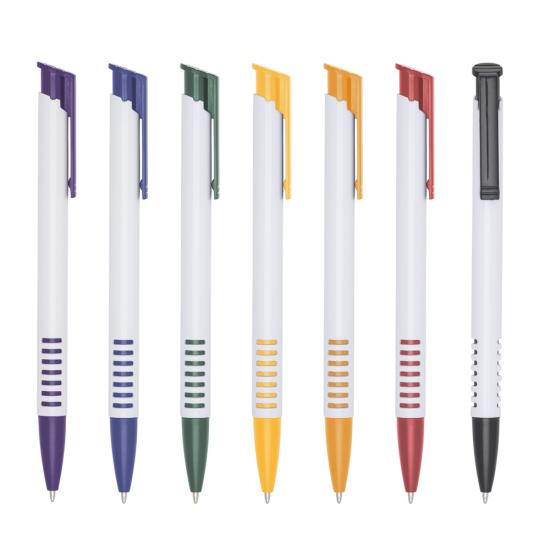 Descrição: Caneta plástica com carga esferográfica azul e acionamento por clique.